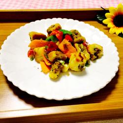 1. Cut the mooncakes into cubes and slice the green and red peppers and carrots.
