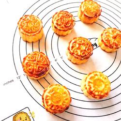 7. Brush some oil on the silicone paper, arrange the mooncakes, bake in the oven for 5 minutes and take them out