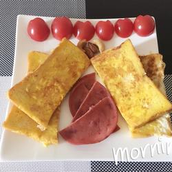 1. Beat the eggs into a plate, cover both sides of the bread with egg liquid, and fry in the pan Golden