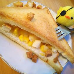 5. Place corn kernels and diced toast on the bottom of the triangular toast6.Cover with triangular cheese slices