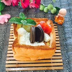 15. Preheat the oven and bake at 150 degrees for ten minutes until the cheese melts, then take it out and use a spoon to scoop out the frozen cheese Scoop out the yogurt and put it into the toast box