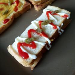 4. Fold the baked toast slices in half.Then use salad dressing and ketchup, as shown in the picture.You can add raisins or your favorite nuts like I did.