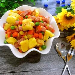 7.During the roasting process, put a little butter in the pot, add diced ham and mixed vegetables in turn, and stir-fry until the mixed vegetables are gone