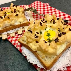 5.Put the toast on a baking sheet, top with whipped egg whites, leaving a small nest in the middle