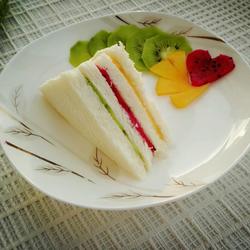 5.Put one kind of fruit on a layer of toast, then stack another layer of toast, place them all and compact them, cut them diagonally, and the beautiful fruit toast sandwich is ready.