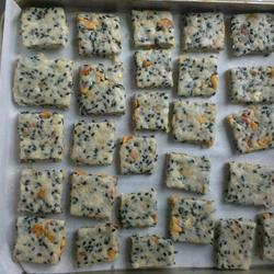5.Cut into small pieces of similar size and line the baking sheet with absorbent paper.Place in the oven and bake until browned on both sides.