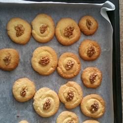 3. Beat the butter, sift in the flour, stir evenly, and spread it on a baking sheet Use a piping bag to extrude the oil paper on top (I used plastic wrap to extrude it, the shape is irregular and the size is different) and then place the walnut kernels.