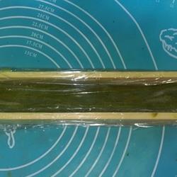 5. Knead them into matcha-colored biscuits, wrap them with plastic wrap, put the matcha biscuits into a rectangular biscuit mold box, shape them into long strips, and spread them on the mold box.Place a layer of plastic wrap in the refrigerator and freeze that layer for 1 hour