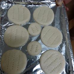 2. Roll the woke noodles into thin slices.About two millimeters.Then use the mouth of the cup to cut out discs.Use a fork to prick some holes on it neatly, firstly for appearance and secondly for ventilation.