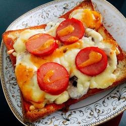 4.Put it in the oven at 180 degrees, heat the upper and lower tubes and bake for 15 minutes.The fragrant banana & red sausage toast is out of the oven!