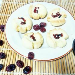 4.Take out the dough after one hour and cut it into 15 grams Make a small dough, then roll it into a round shape, place it on a baking sheet lined with oiled paper, press it in the middle with your thumb, and natural cracks will appear around it.Preheat the oven to 170 degrees.Then place chopped cranberries in the recess.Place in the oven and bake for 15 minutes.