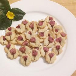 7. Squeeze out the moisture from the cherry blossoms and place them in the middle of the biscuits, then press them with your hands.