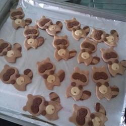 7. Heat up and down at 120 degrees, in the middle of the oven, for 15 minutes.It’s almost time to check.To avoid overdoing it and making the color look ugly, after it cools, melt the chocolate in a piping bag and draw eyes, nose, and navel