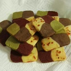 7. Divide the stirred butter into four parts, sieve matcha powder, cocoa powder, and red yeast powder into three parts, and mix in the fourth part Enter the dried cherry tomatoes~