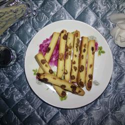 It is recommended to chop the raisins into small pieces, otherwise they will bubble a little when baking, causing the biscuit strips to break in the middle.The oven temperature depends on the temperament of your own oven.If you like it crispy, bake it for a while.My baking pan is 28*23 and can bake two pans., raisins can also be replaced with cranberries or other dried fruits