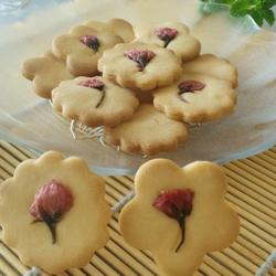 6.Put the shaped cookie pan into the baking pan, remove the moisture from the cherry blossoms, and place them on the cookies on and press lightly.