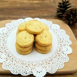 15. Preheat the oven, then take out the frozen biscuit strips from the refrigerator and cut them into thicknesses of about 0.8 centimeter disc.Arrange evenly on the baking sheet.