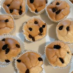 In fact, the raisins can be placed directly in the mixed paste.I made 17 in this amount I baked a paper cup twice.In order to speed up the second time, I added an appropriate amount of raisins directly to the mixed batter, then stirred evenly into the paper cup, and then added some raisins on top.