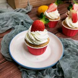 10. Whip the whipped cream, put it into the piping tip, pipe it on the cup cake and put the strawberries on it and it’s ready