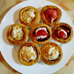 The fruits must be kept raw and not baked with the egg tarts, so that they are delicious.