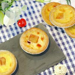 5. Place the egg tart shell on the baking sheet, then cut the fruit into pieces and filter them Pour in the egg tart water.