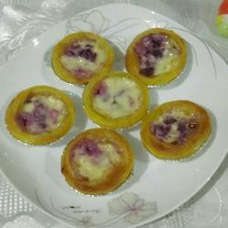 Egg tart crust, whipping cream, milk, sugar, eggs ( Six tart crusts, 30 grams of whipping cream, 40 grams of milk, 20 grams of sugar, One egg ) | Cooked purple sweet potato ( a little ) |
