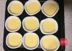 8.Put the egg tart liquid into the egg tart shell and place it on the baking sheet