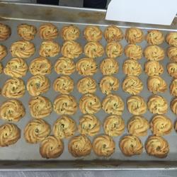 4.Add low flour and mix into a batter, bake in the oven at 190℃ and then lower to 170℃ for 15 to 20 minutes