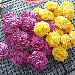 Tip: The oven temperature depends on your personal oven.The ingredients are for reference only.Depend on the amount of sweet potatoes and purple potatoes left.Add light cream and cold boiled water.Only use for mounting.Just use a flower bag to squeeze out the flower shape.This cookie is soft, waxy and sweet, not as crispy as cookies.Understand that this sweet potato cookie is a different cookie.