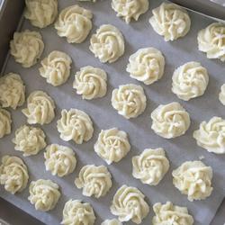 3. Add half of the milk and coconut milk and beat until evenly mixed.Add the other half of the milk.Then sift the flour and mix it in, mix well and then use a piping bag or piping gun to extrude it.Preheat the oven to 180 degrees and bake for about 25 minutes.