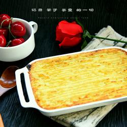 11. Then spread the mashed potatoes to completely cover the meat sauce, and use a fork to scrape out the surface texture.
