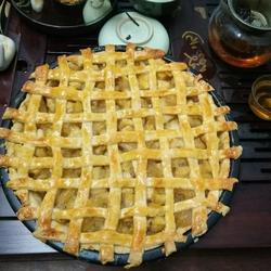 7. Roll out a pie crust to the size of a pizza pan, cut into strips, and spread them staggered on top Top with apple filling.(Forgot to take a picture) Preheat the oven to 180°C for 10 minutes, rinse with egg yolk liquid, then bake in the oven for 35 minutes.