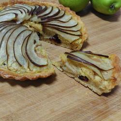 13. Pour the filling into the bottom of the pie and smooth it out, then put the sliced pears