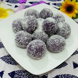 10.After steaming, take it out and prepare coconut paste.Coat the purple potato balls with coconut paste while they are hot, otherwise the surface will not stick and it will be difficult to coat them with flour