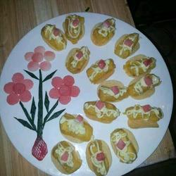 2.Put the diced mango on the potato chips and add the salad dressing.