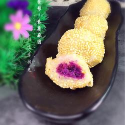6.Take a ball, flatten it, add purple sweet potato puree, wrap it like glutinous rice balls, and then roll it in sesame seeds