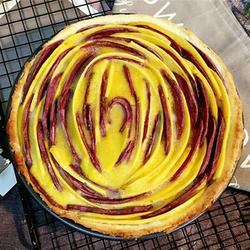 7. Pour the mixed pumpkin puree evenly onto the dough in the baking pan, and put the sweet potato purple Arrange the potato slices alternately along the baking sheet until they are completely covered.Brush with an even layer of oil.