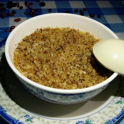9.Ten minutes later, the egg liquid has solidified.Sprinkle a layer of walnut powder on top and cover it again.Cover with plastic wrap, continue to steam for five minutes, then steam for another two minutes, and it’s ready