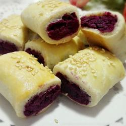 9. Line a baking sheet with oil paper or tin foil, put purple potato rolls in, and brush the surface Egg liquid, sprinkle some sesame seeds, preheat the oven in advance, bake at 180 degrees for 20 minutes, the surface will be golden!