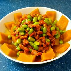 1. Prepare the ingredients ~ Peel the pumpkin, wash and cut into small pieces Blocks~shell the edamame~boil the edamame rice in boiling water for one minute, remove and set aside~wash and cut the pork~use light soy sauce~dark soy sauce~salt~sugar~cornstarch~oil and marinate for fifteen minutes~remove the garlic and mince it ~Remove and chop dry onions