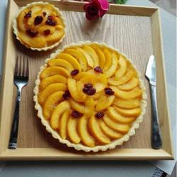 Arrange yellow peaches evenly on the orange jam, and then decorate with crescent moon plums.