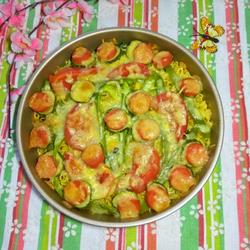 1. Prepare the ingredients, shrimp and fish noodles, cucumber, green pepper, tomato, ham sausage, and mozzarella cheese.