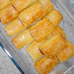 5. Cut the wrapped dough sticks into equal pieces and place them on the baking sheet.Brush with egg wash and sprinkle with sesame seeds, preheat the oven to 190 degrees, put it in the oven, and bake for 20 minutes;
