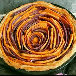 3. The bottom of the flying cake brush is filled with jam, one sweet potato slice and one purple Alternately arrange the potato chips into a circle in the center (I forgot to put jam on the bottom of the pie crust when I was doing it, so I took it all apart and started circling again.Don’t make this mistake)