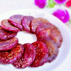 5.Preheat the pan and add peanut oil.When the oil is hot, add the purple potato cakes and fry slowly over low heat