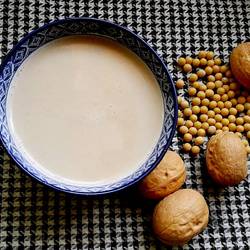 4. Wash the soaked soybeans and rice, and pour the walnut kernels and oatmeal together.Put into soymilk machine.