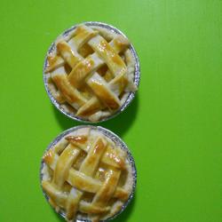 3. Divide the dough into 9 portions, roll 2/3 of each portion into a round shape and place it in a tart cup Make the base, place the filling, then roll the remaining 1/3 into a round shape, cut into 6 strips on average, cover the filling and braid.Place the finished pie on the baking sheet and set aside.
