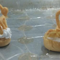 Step 7: The remaining steps to make the swan puffs: squeeze the cream into the puffs with a round bottom, insert the semicircular puffs and the swan head (forgot to take a picture).Circle puffs are made by cutting the puffs in half vertically, squeezing the cream in, and finally closing them.The same goes for long puffs.