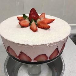 12. Pick up the prepared strawberry mousse cake and shake it gently twice , let the bubbles inside disappear, put it in the refrigerator for two or three hours, take it out and sprinkle it with some grated coconut
