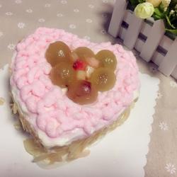 8. Then stick almond slices around the outside of the cake , put a few grapes and peach pieces in the middle of the heart